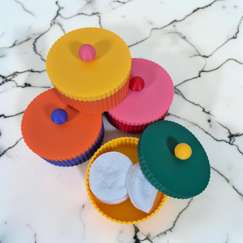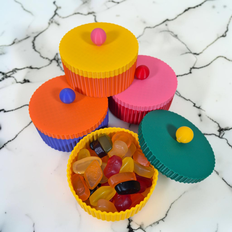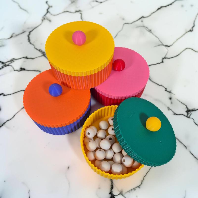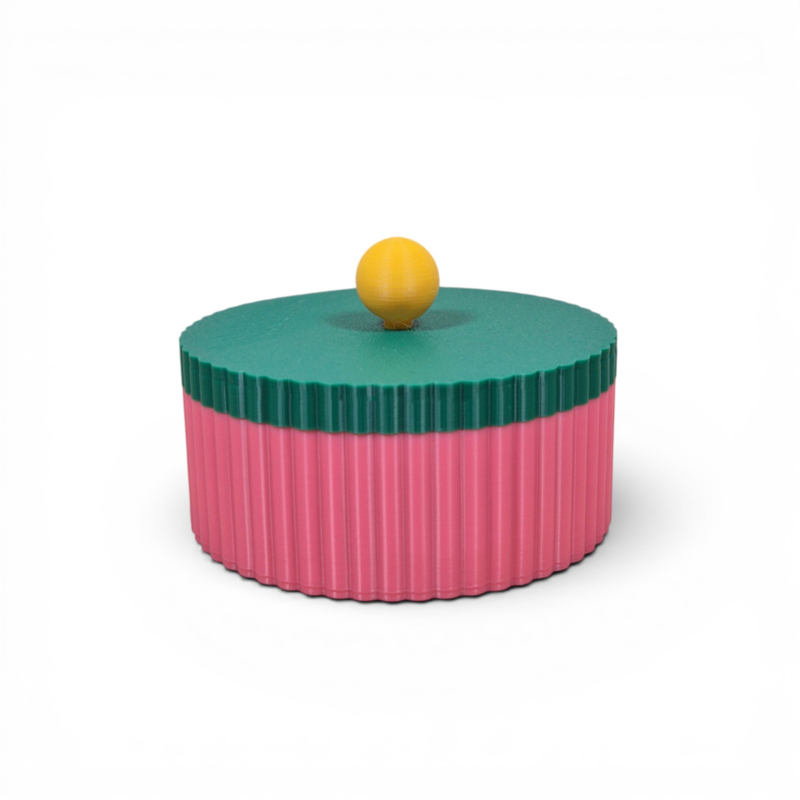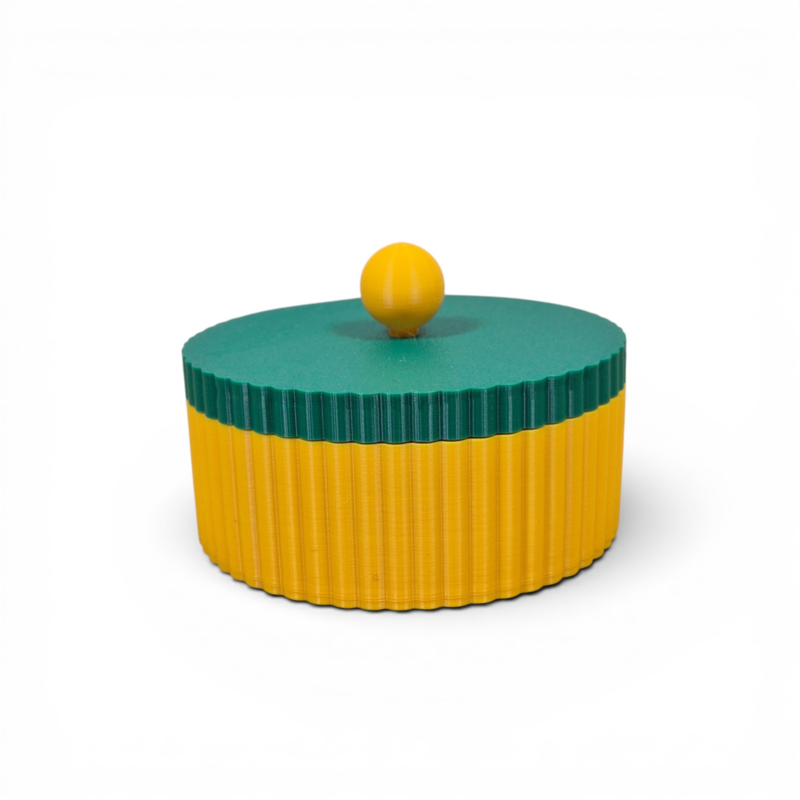Dit 3D-geprinte opbergdoosje is perfect voor het opbergen van snoepjes, kralen, sieraden of andere kleine spulletjes. Met een afmeting van 10 cm diameter en 4,5 cm hoogte (zonder dop) is het compact en praktisch. Het doosje kan gepersonaliseerd worden in kleur: kies je favoriete combinatie voor de onderkant, bovenkant en het dopje. Gemaakt van duurzaam PLA en ideaal als uniek cadeau of decoratief item.