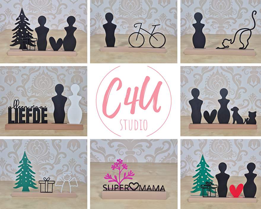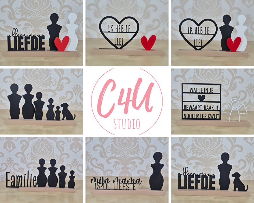 Ontwerp jouw unieke decoratie met personaliseerbare 3D blokjes van C4U Studio. Combineer figuurtjes, hartjes, pompoenen, kerstbomen en meer om je eigen gezin of feestelijke set samen te stellen.